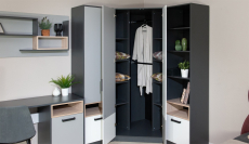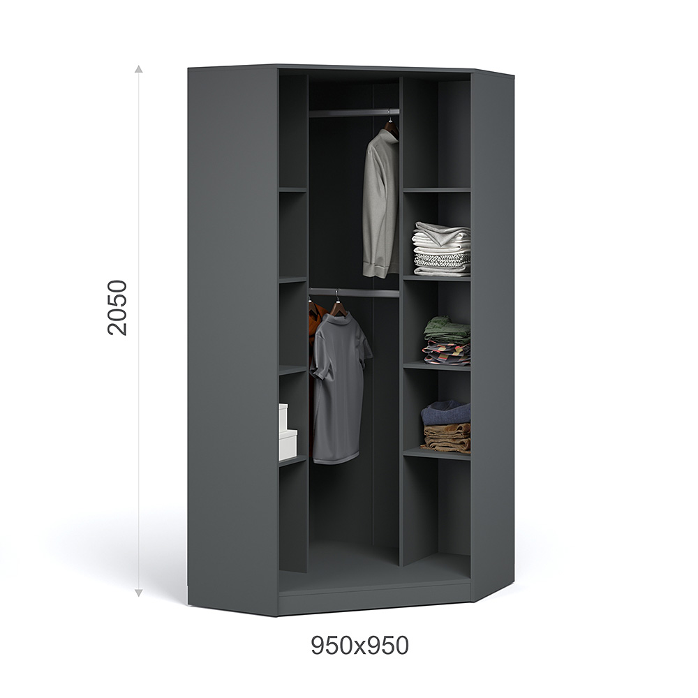 Угловой шкаф Квадро с полками и двумя штангами для вешалок для верхней и сезонной одежды.