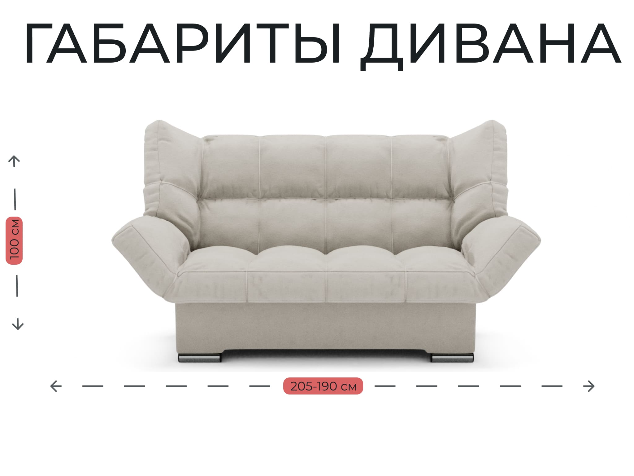 Размеры: длина -205-190см. высота - 100 см, ширина - 100 см. Обивка выполнена из текстиля, цвет фисташковый. Глубина сиденья - 65 см, длина спального места - 205 см. Глубина дивана - 100 см, максимальная нагрузка - 220 кг.