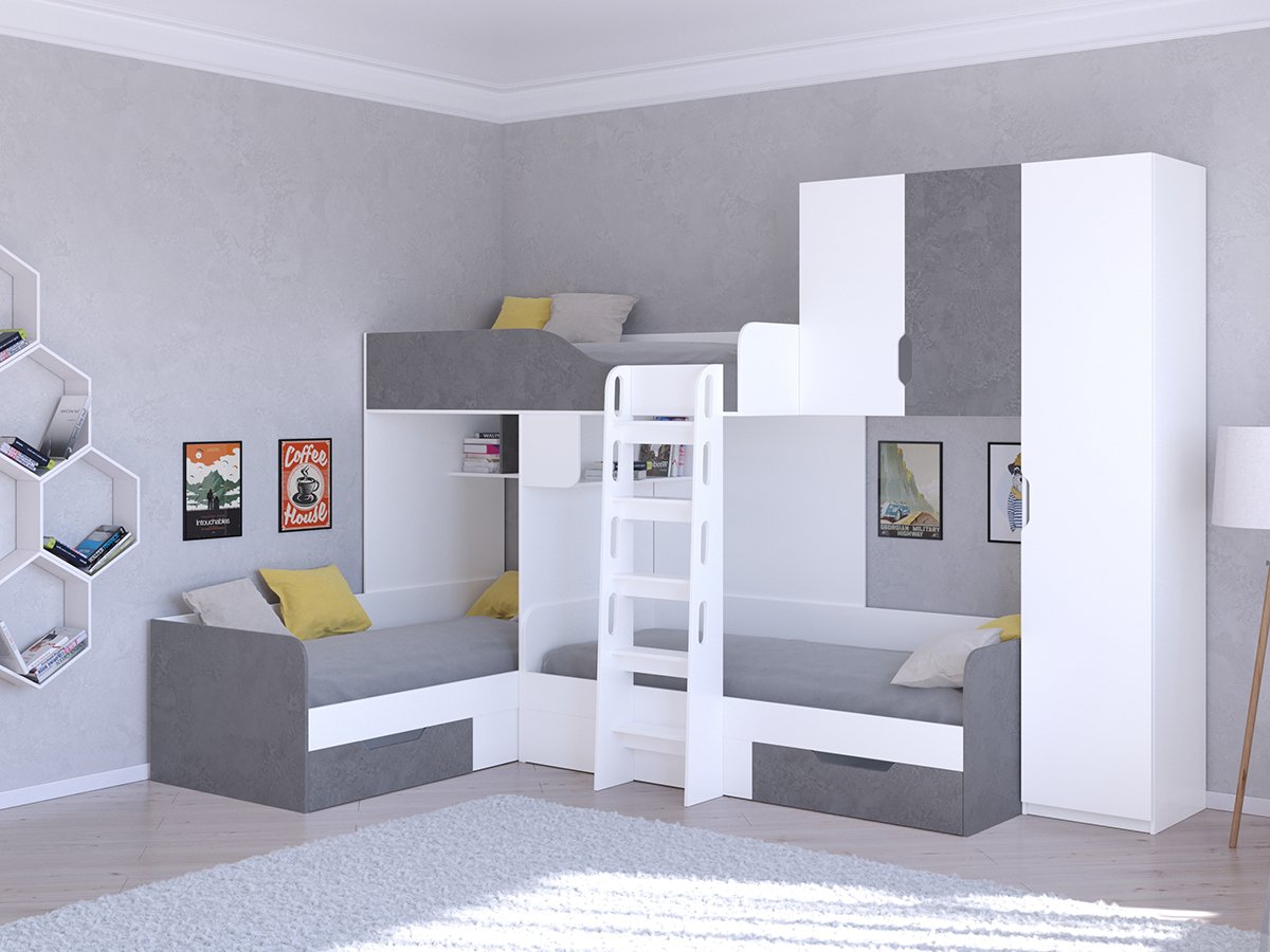 Двухъярусная кровать Трио/2 является субкомпактным вариантом размещения сразу трех детей. За счет углового исполнения она позволит сэкономить полезное пространство в комнате. Но относительно компактные размеры не сказались на функционале - кровать обладает тремя полноценными спальными местами, а так же полочками и ящиками. В отличии от базовой версии кровати данная модель дополнена высоким пеналом с пятью полками и вместительной антресолью. Благодаря этому можно с удобством хранить еще больше вещей.