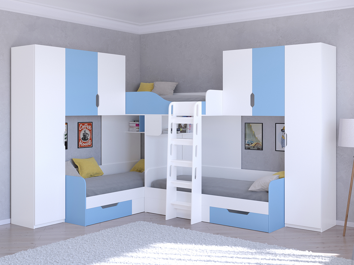 Двухъярусная кровать Трио/3 является субкомпактным вариантом размещения сразу трех детей. За счет углового исполнения она позволит сэкономить полезное пространство в комнате. Но относительно компактные размеры не сказались на функционале - кровать обладает тремя полноценными спальными местами, а так же полочками и ящиками. В отличии от базовой версии кровати данная модель дополнена двумя высокими пеналами с пятью полками и двумя вместительными антресолями. Благодаря этому можно с удобством хранить еще больше вещей.