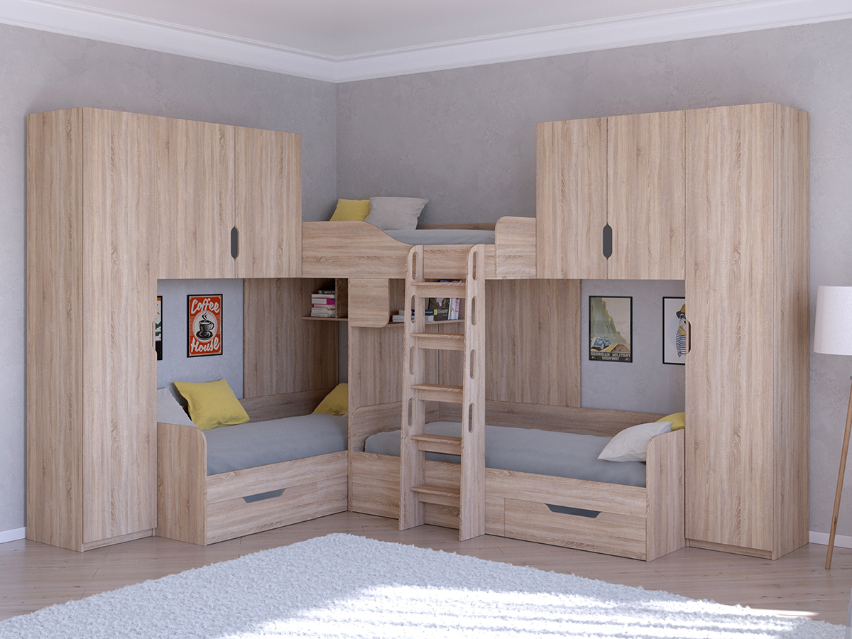 Двухъярусная кровать Трио/3 является субкомпактным вариантом размещения сразу трех детей. За счет углового исполнения она позволит сэкономить полезное пространство в комнате. Но относительно компактные размеры не сказались на функционале - кровать обладает тремя полноценными спальными местами, а так же полочками и ящиками. В отличии от базовой версии кровати данная модель дополнена двумя высокими пеналами с пятью полками и двумя вместительными антресолями. Благодаря этому можно с удобством хранить еще больше вещей.
