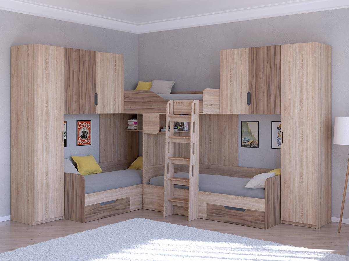 Двухъярусная кровать Трио/3 является субкомпактным вариантом размещения сразу трех детей. За счет углового исполнения она позволит сэкономить полезное пространство в комнате. Но относительно компактные размеры не сказались на функционале - кровать обладает тремя полноценными спальными местами, а так же полочками и ящиками. В отличии от базовой версии кровати данная модель дополнена двумя высокими пеналами с пятью полками и двумя вместительными антресолями. Благодаря этому можно с удобством хранить еще больше вещей.